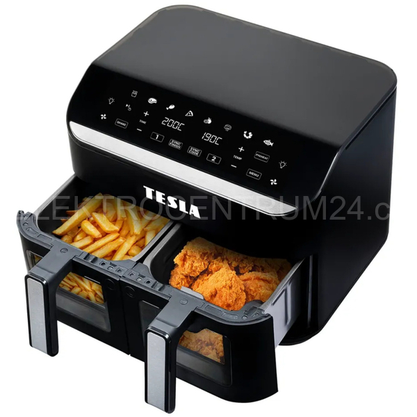 Dva 4,5l koše s nezávislým nastavením, funkce Sync Cook/Finish, sušení, 8 programů, až o 85 % méně tuku, okénka s osvětlením, dotykové ovládání, snadné čištění, ochrana proti přehřátí.